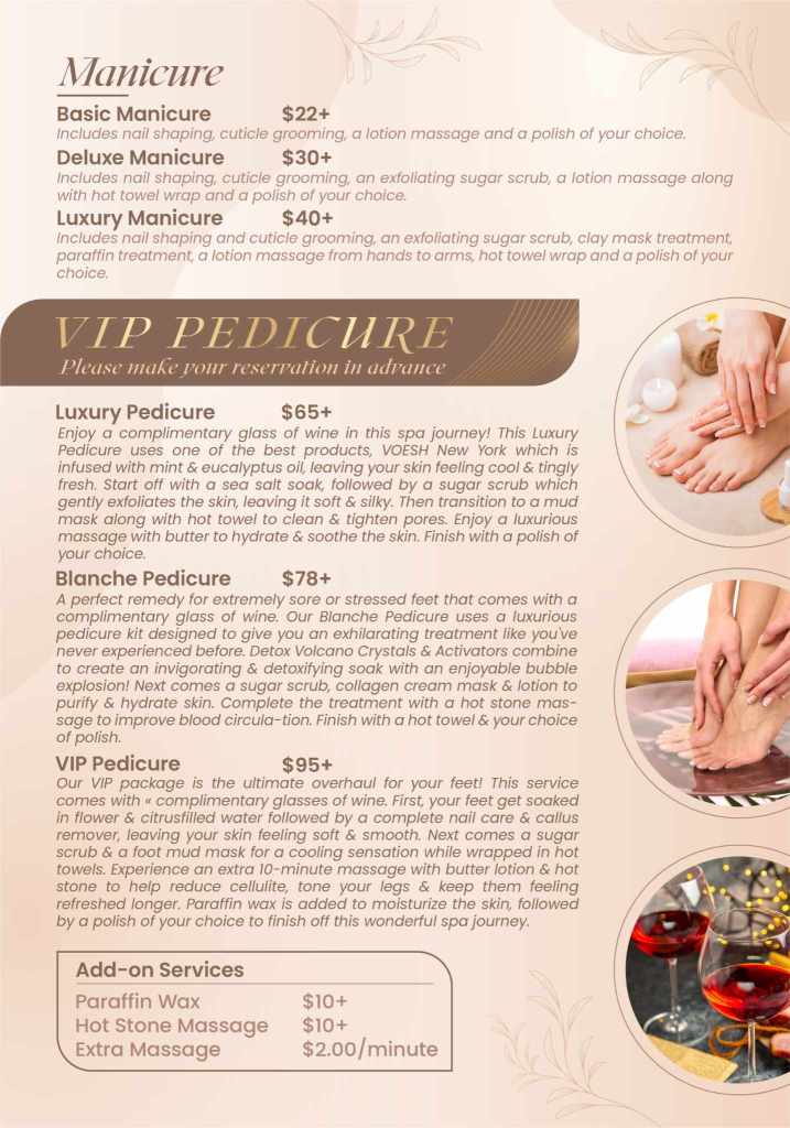 A perfect remedy for extremely sore or stressed feet that comes with a complimentary glass of wine. Our Blanche Pedicure uses a luxurious pedicure kit designed to give you an exhilarating treatment like you’ve never experienced before. Detox Volcano Crystals & Activators combine to create an invigorating & detoxifying soak with an enjoyable bubble explosion! Next comes a sugar scrub, collagen cream mask & lotion to purify & hydrate skin. Complete the treatment with a hot stone massage to improve blood circulation. Finish with a hot towel & your choice of polish.