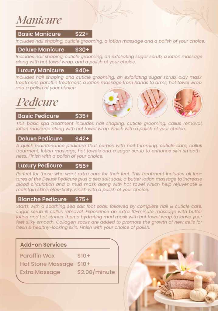 This basic spa treatment includes nail shaping, cuticle grooming, callus removal, lotion massage along with a hot towel wrap. Finish with a polish of your choice.